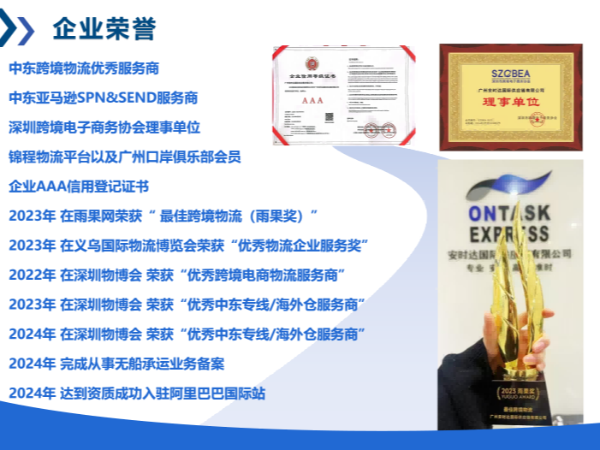 深耕中东,载誉前行。近日,安时达中东物流凭借在跨境物流领域的卓越表现,荣膺2024年度跨境电商雨果奖“最佳跨境物流”大奖。这一荣誉,是行业对我们深耕中东与迪拜专线、服务中国品牌出海的高度认可,更是对安时达多年来专业实力与行业影响力的有力肯定。