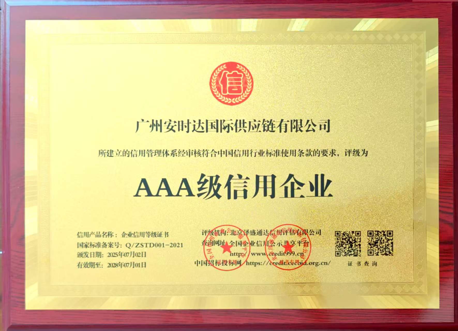 恭喜广州安时达中东物流获评AAA级信用企业!该认证由北京泽盛通达信用评估有限公司依据中国信用行业标准颁发,是企业信用实力的权威证明。